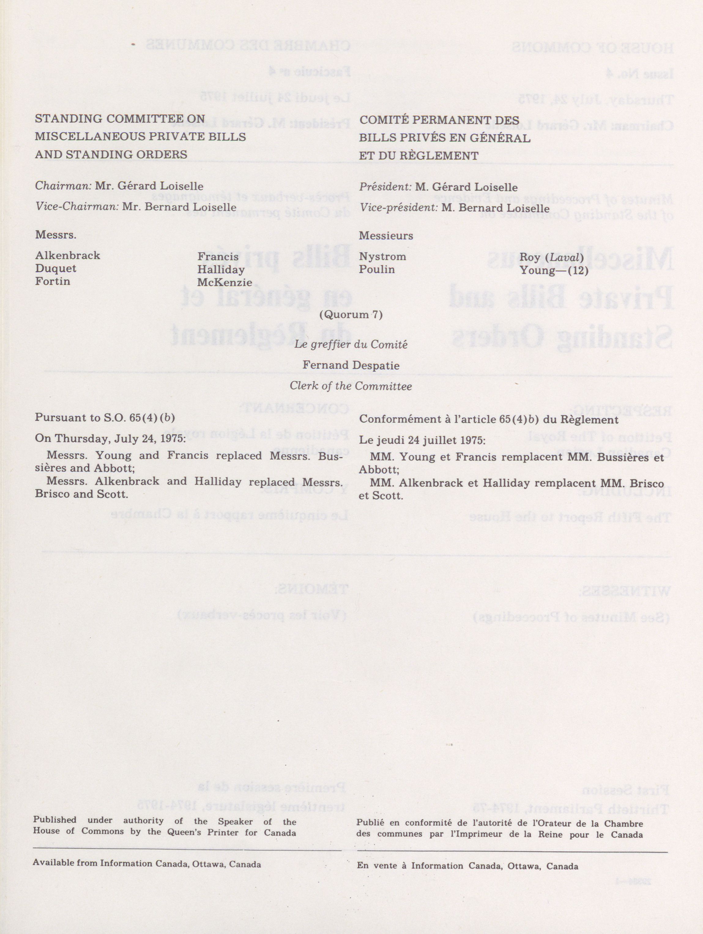 House of Commons Committees, 30th Parliament, 1st Session : Standing Committee on Miscellaneous Private Bills and Standing Orders, vol. 1 = Comités de la Chambre des communes, 30e Législature, 1re Session : Comité permanent des bills privés en général et du Règlement, vol. 1