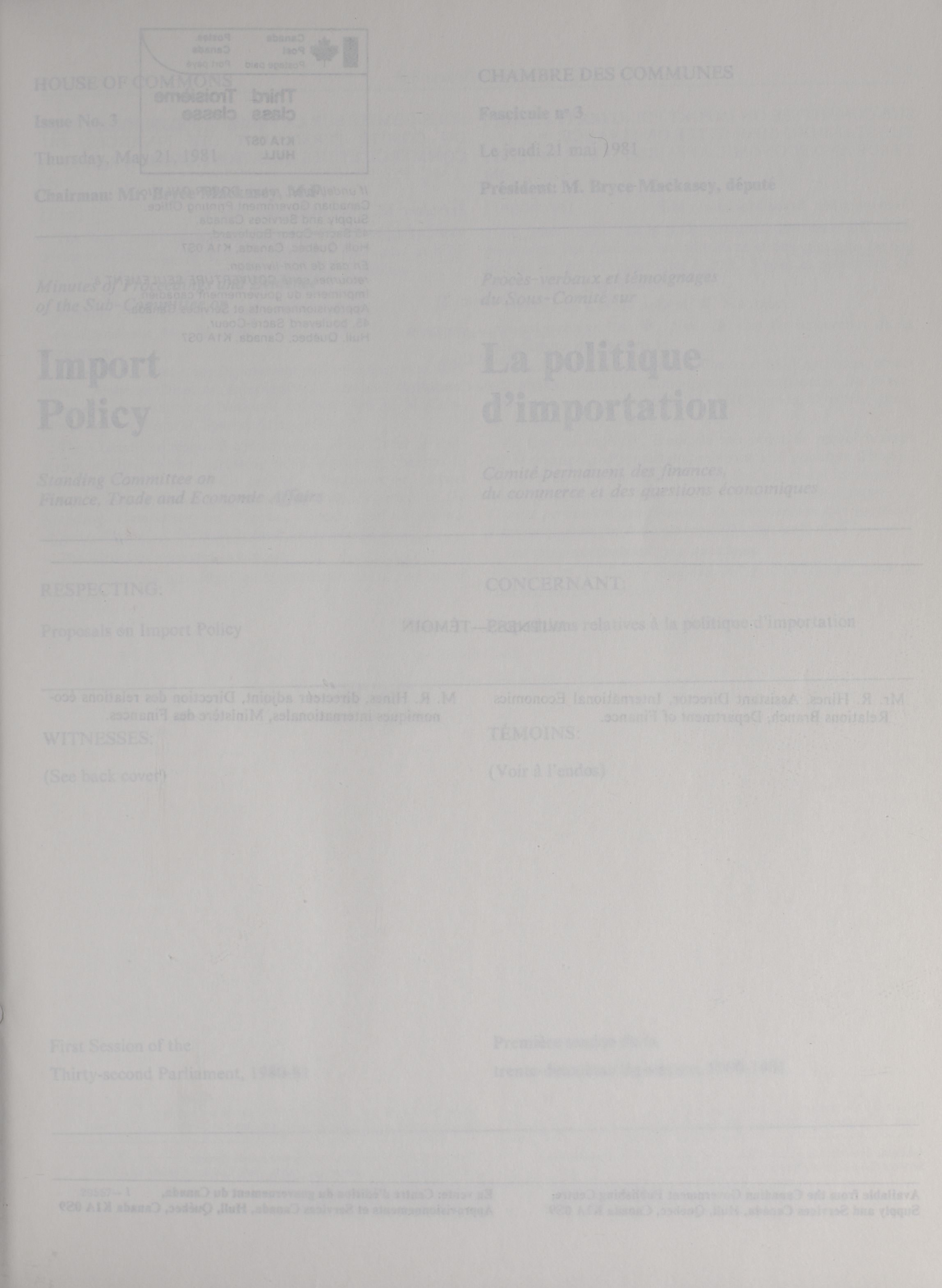 House of Commons Committees, 32nd Parliament, 1st Session : Sub-Committee on Import Policy, vol. 1 = Comités de la Chambre des communes, 32e Législature, 1re Session : Sous-comité sur la politique d'importation, vol. 1