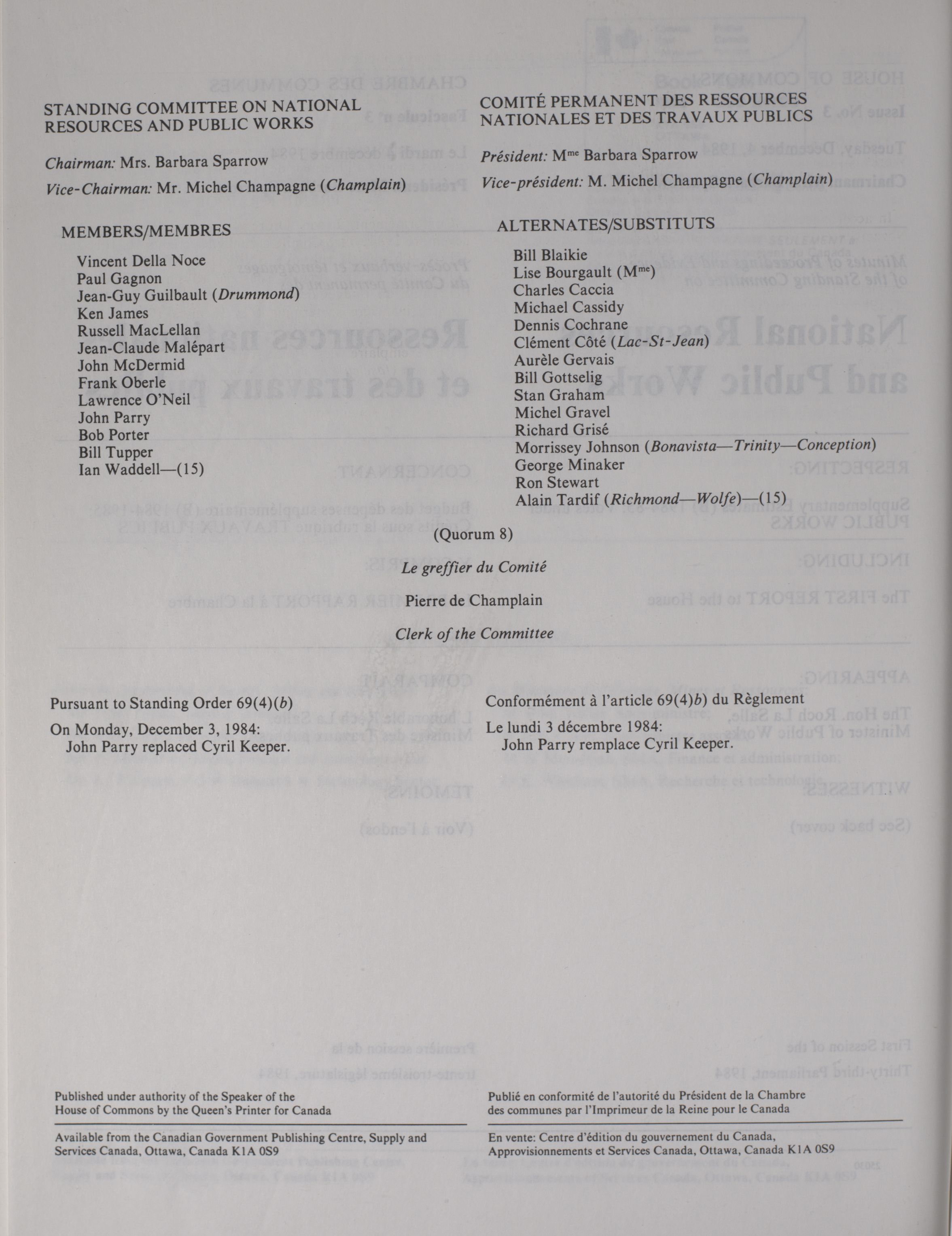 House of Commons Committees, 33rd Parliament, 1st Session : Standing Committee on National Resources and Public Works, vol. 1 no. 1-33 = Comités de la Chambre des communes, 33e Législature, 1re Session : Comité permanent des ressources nationales et des travaux publics, vol. 1 no. 1-33