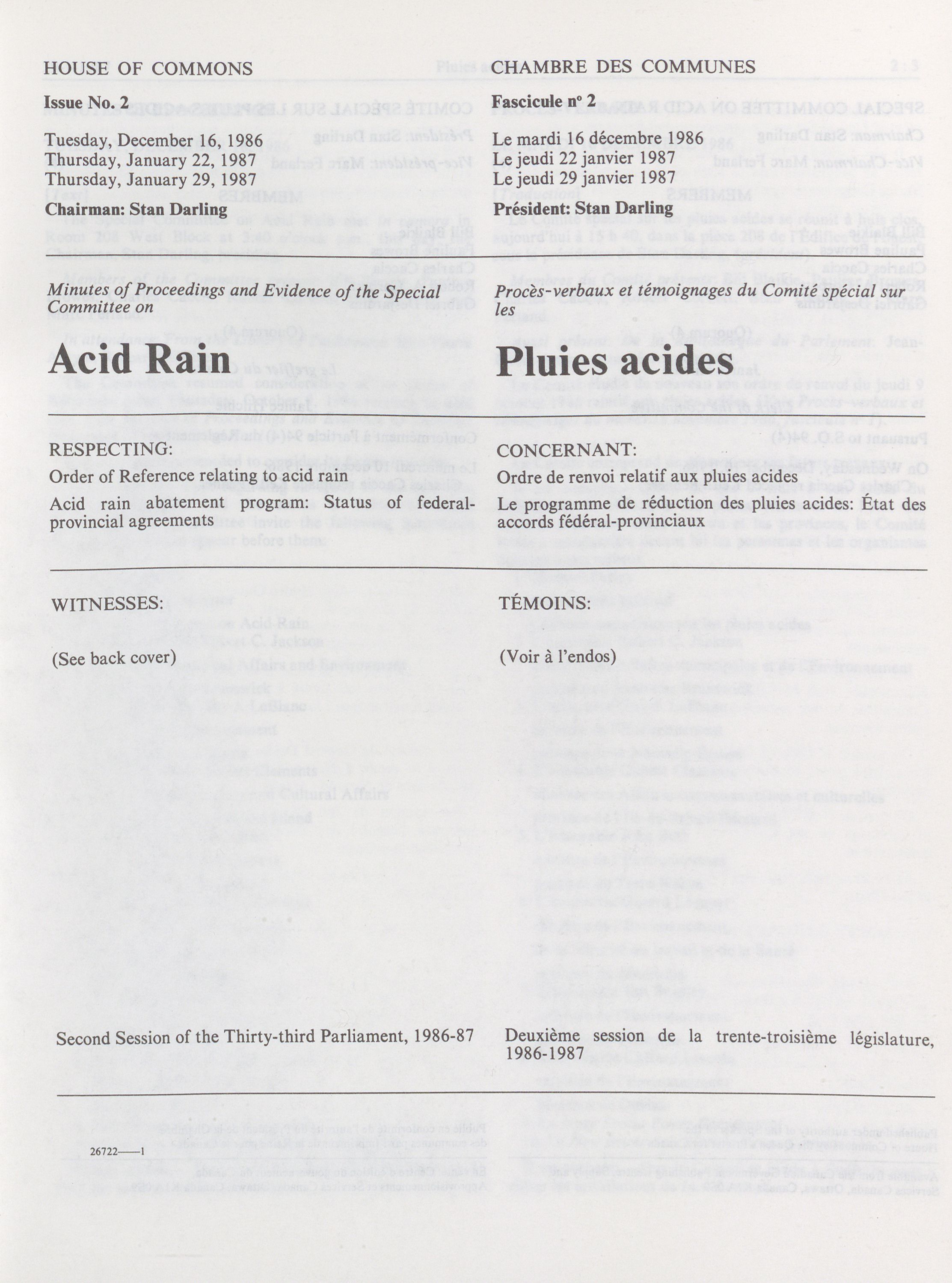 House of Commons Committees, 33rd Parliament, 2nd Session : Special Committee on Acid Rain, vol. 1 = Comités de la Chambre des communes, 33e Législature, 2e Session : Comité spécial sur les pluies acides, vol. 1