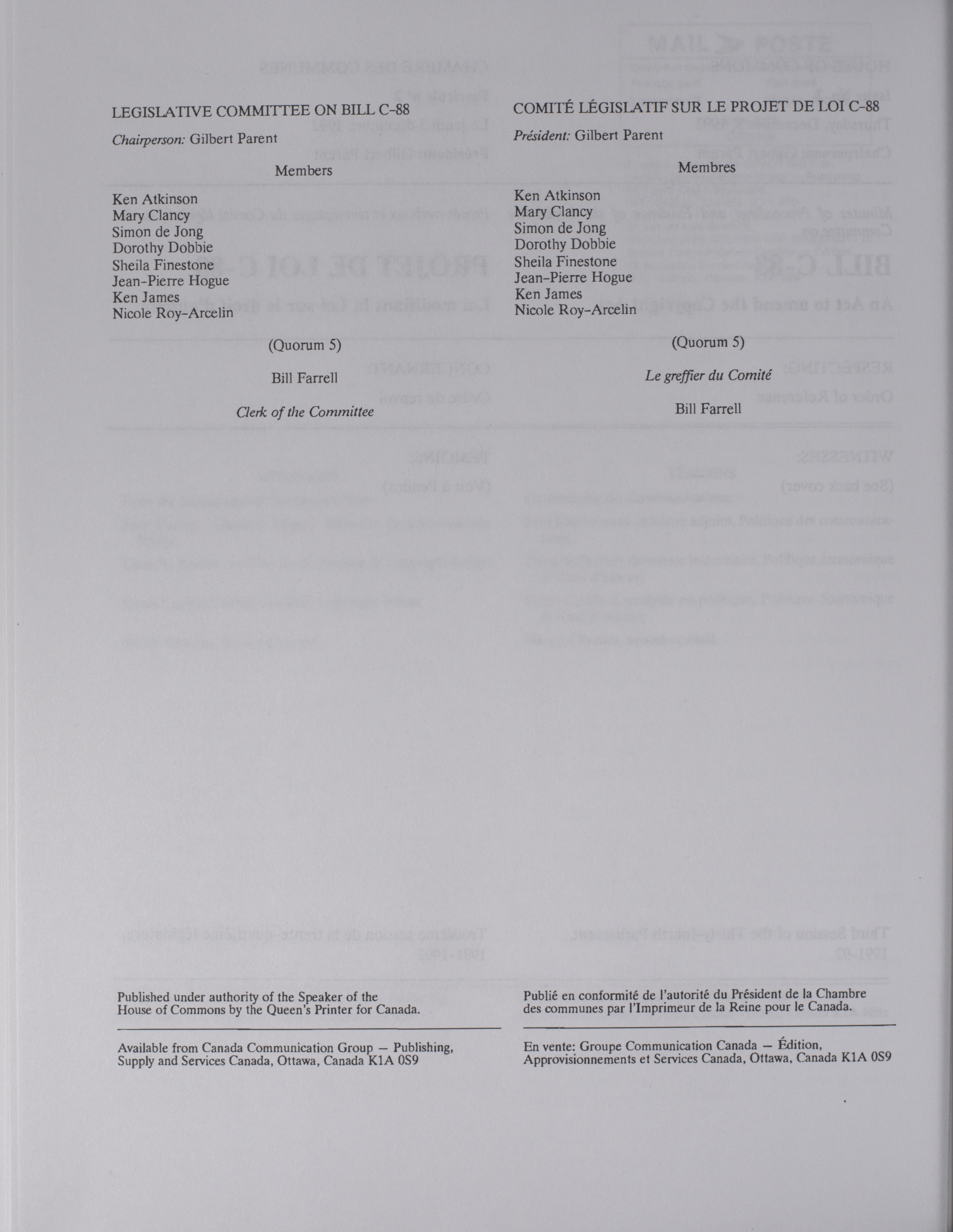House of Commons Committees, 34th Parliament, 3rd Session : Legislative Committee on Bill C-88, an Act to amend the Copyright Act, vol. 1 no. 1-6 = Comités de la Chambre des communes, 34e Législature, 3e Session : Comité législatif sur le projet de loi C-88, Loi modifiant la Loi sur le droit d'auteur, vol. 1 no. 1-6