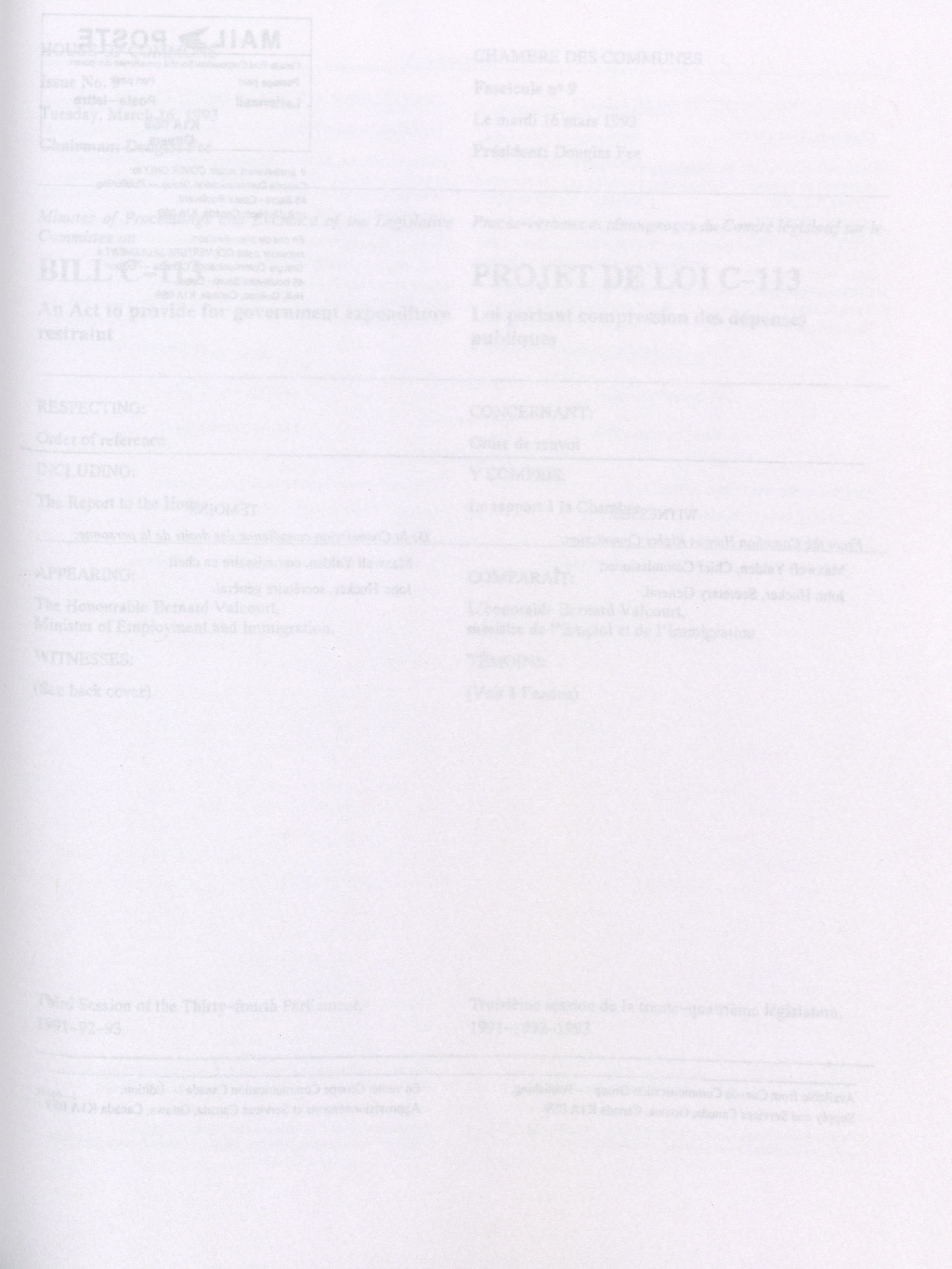 House of Commons Committees, 34th Parliament, 3rd Session : Legislative Committee on Bill C-113, an Act to provide for government expenditure restraint, vol. 1 no. 1-9 = Comités de la Chambre des communes, 34e Législature, 3e Session : Comité législatif sur le projet de loi C-113, Loi portant compression des dépenses publiques, vol. 1 no. 1-9