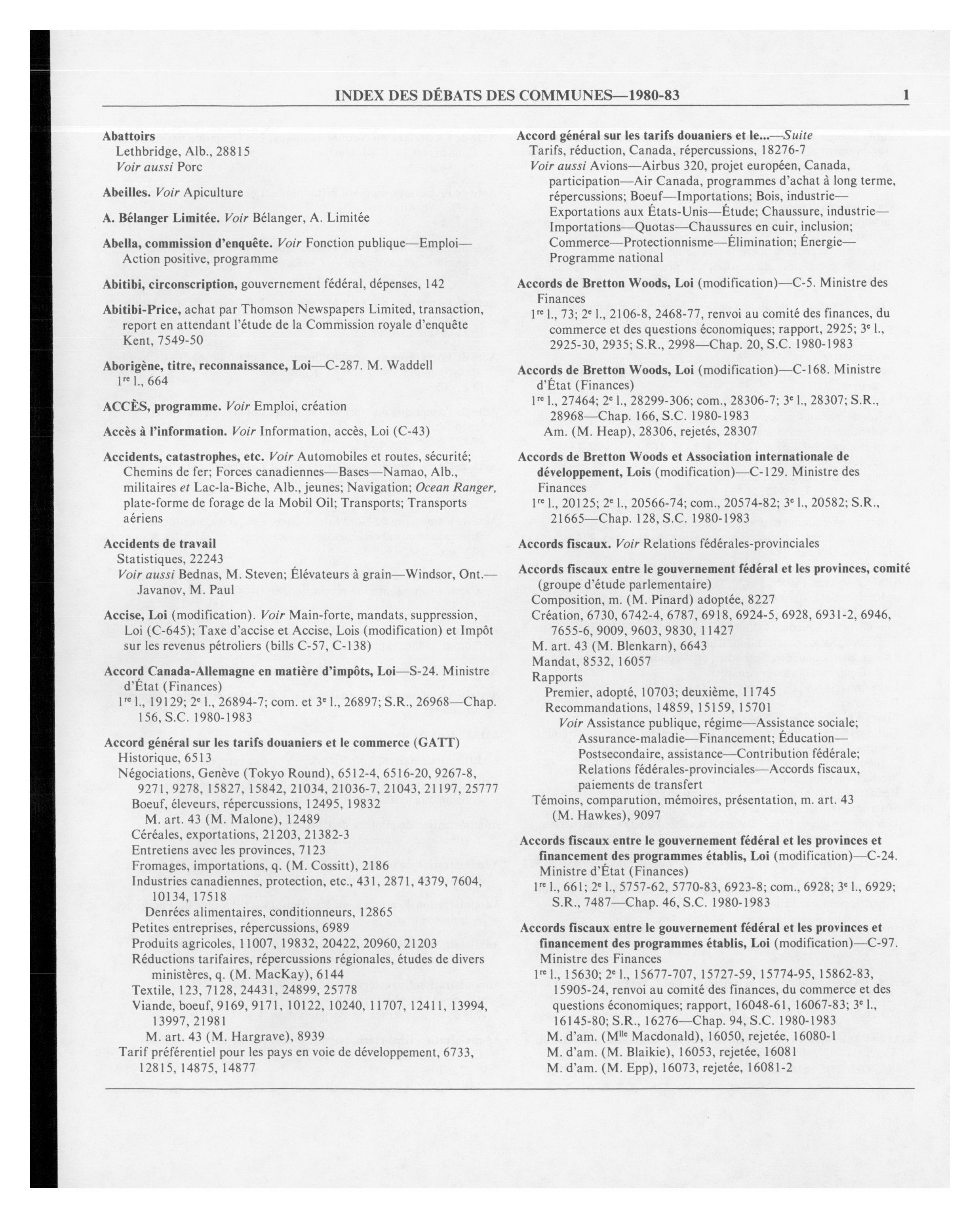 Débats de la Chambre des communes, 32e Législature, 1re Session : Index
