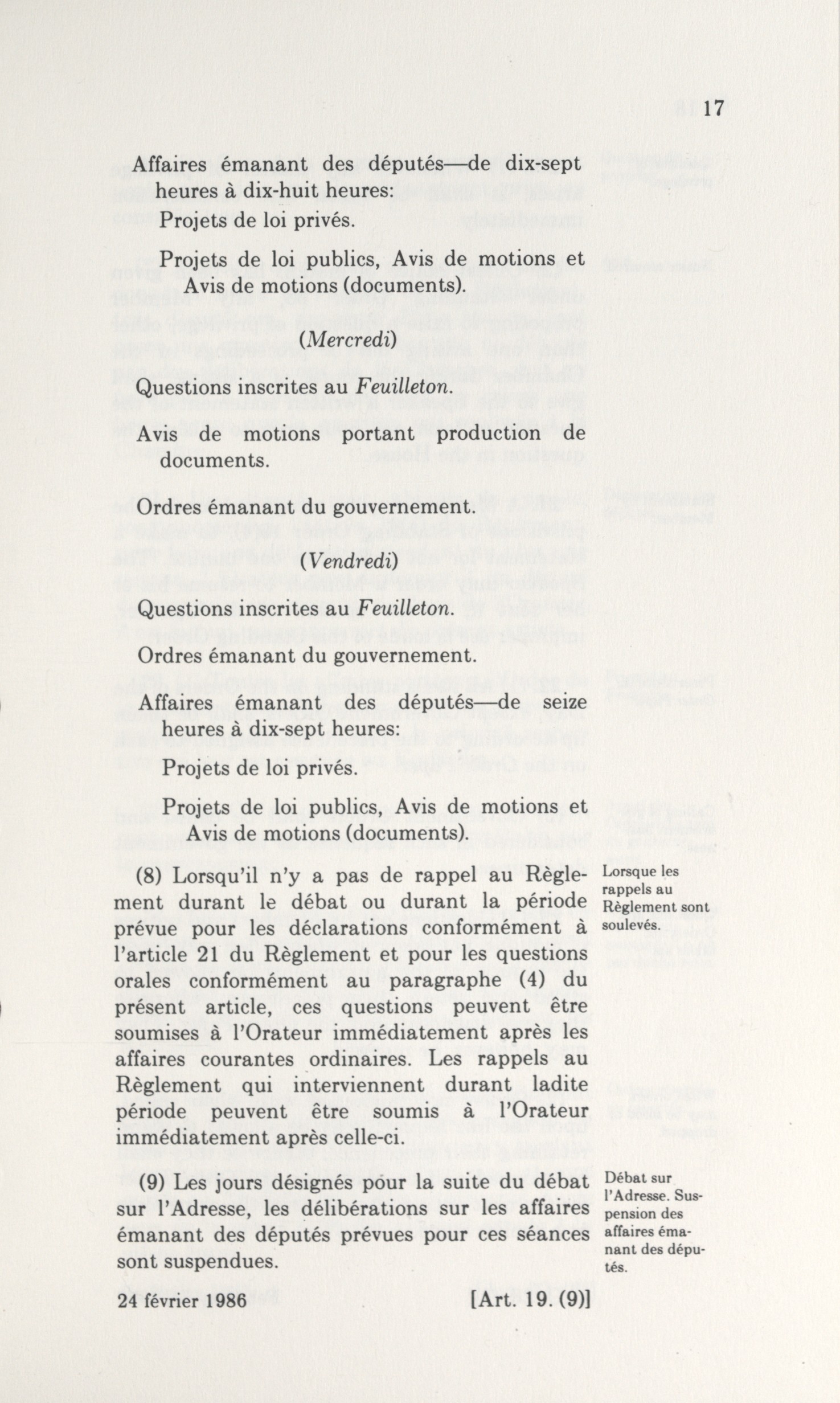 Permanent and Provisional Standing Orders of the House of Commons, 1986 = Règlement de la Chambre des communes : articles permanents et provisoires, 1986