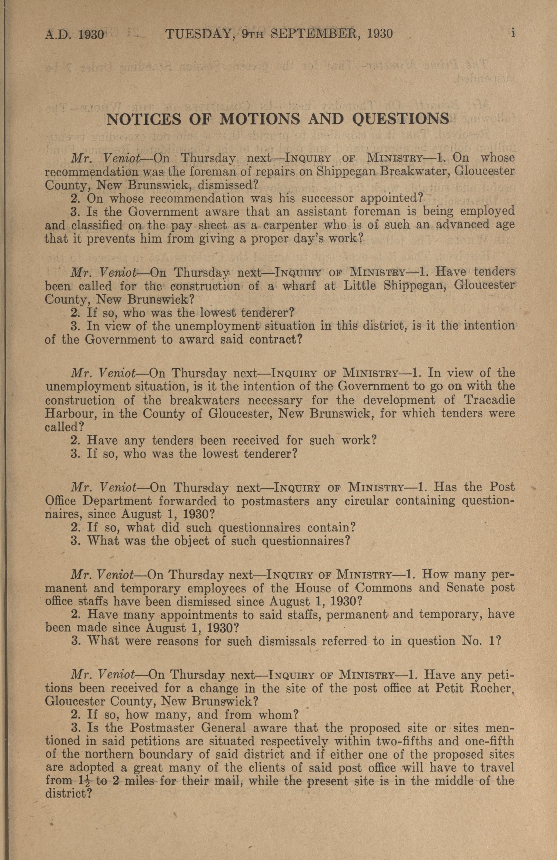 House of Commons Votes and Proceedings, 17th Parliament, 1st Session : 1-12