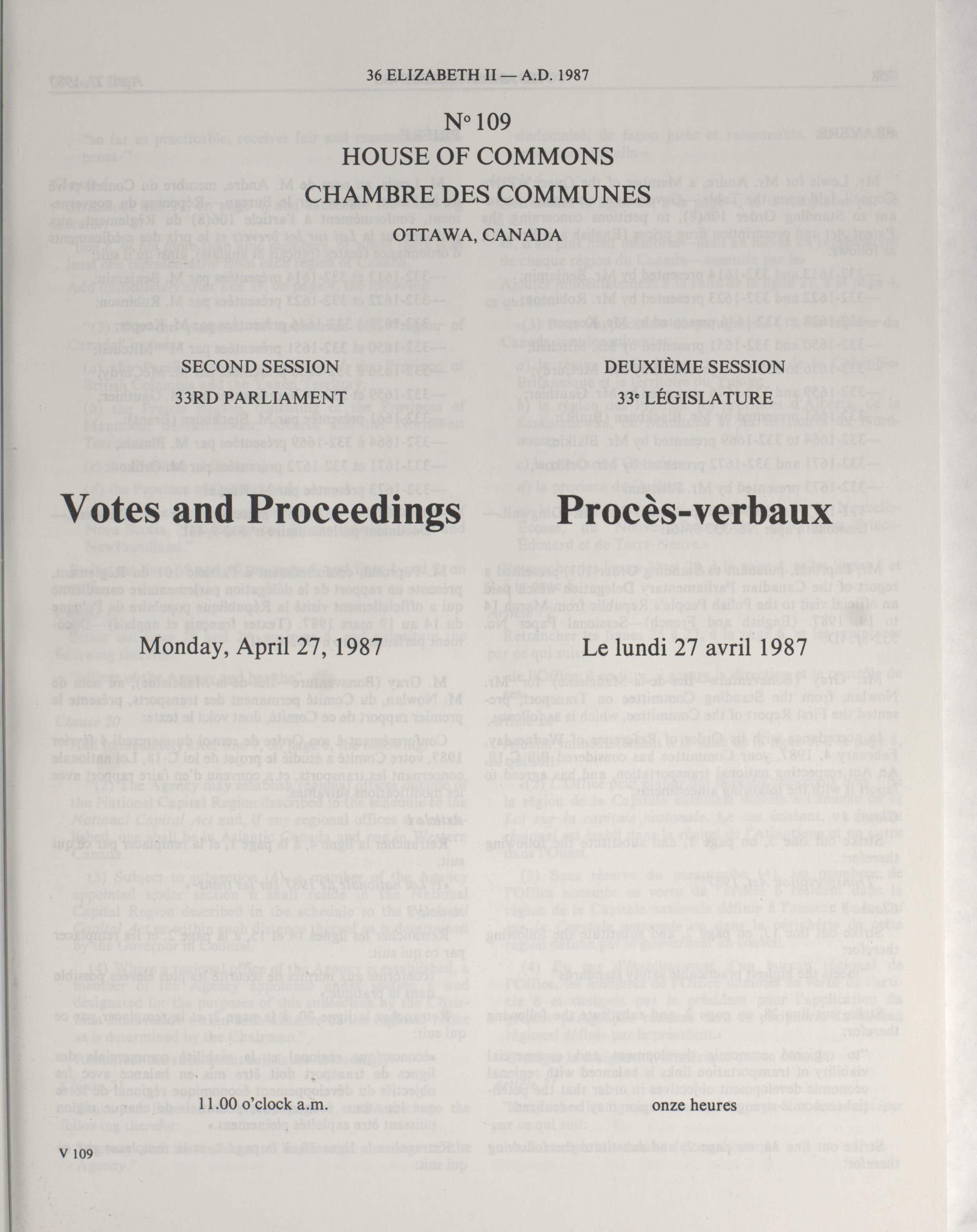 House of Commons Votes and Proceedings, 33rd Parliament, 2nd Session : 101-187:1 = Procès-verbaux de la Chambre des communes, 33e Législature, 2e Session : 101-187:1